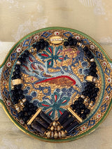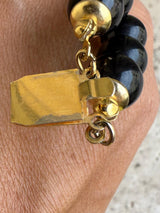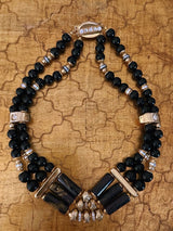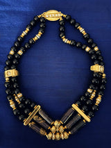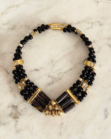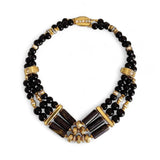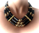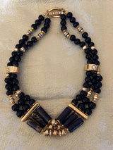 A striking multi-strand necklace featuring bold black stones and intricate gold-tone accents. This piece embodies confidence and sophistication, making it perfect for both casual and formal occasions.