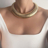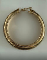 Sculptural tubular collar composed of tightly articulated gold-tone segments, creating a fluid, serpentine silhouette around the neck. Sleek yet powerful, this piece embodies the era’s fascination with precision, movement, and minimalist luxury—designed to sit high and command attention.