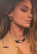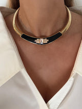 Structured torque collar with ribbed gold detailing and high-contrast black enamel. Architectural lines meet unapologetic glamour, designed to sit high on the neck and command attention.